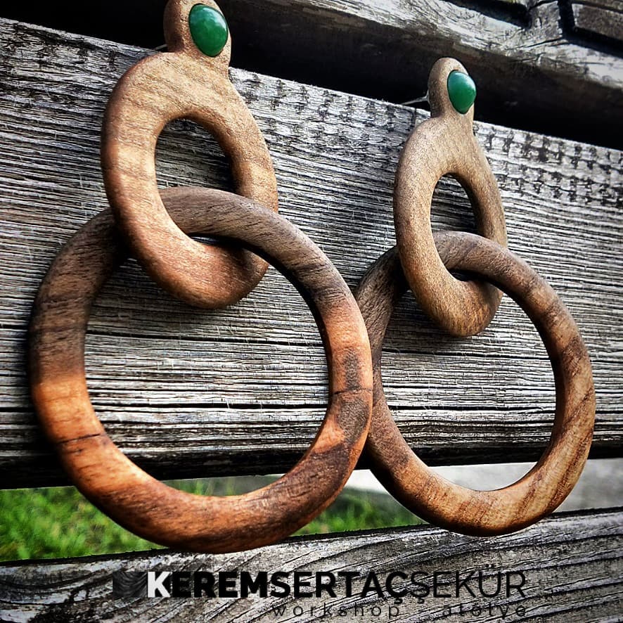 Ceviz Ağacından Doğal Taşlı Ahşap Küpe (Sarmal)